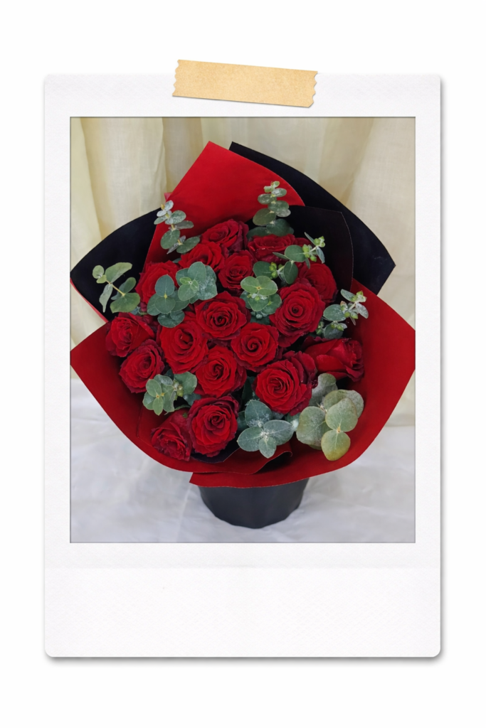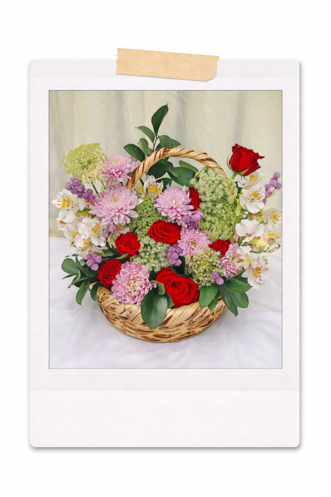 Canasta doble vista de rosas y roxanas, un diseño duradero y fresco, que expresa gratitud y deseo de abundancia para una persona especial