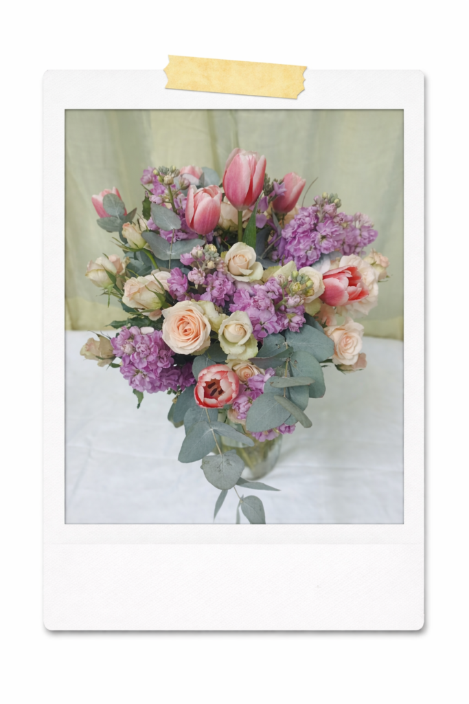Delicado y aromático atado de 9 tulipanes, mini rosas y matthiolas. Simboliza la belleza eterna, fidelidad y amor duradero.
